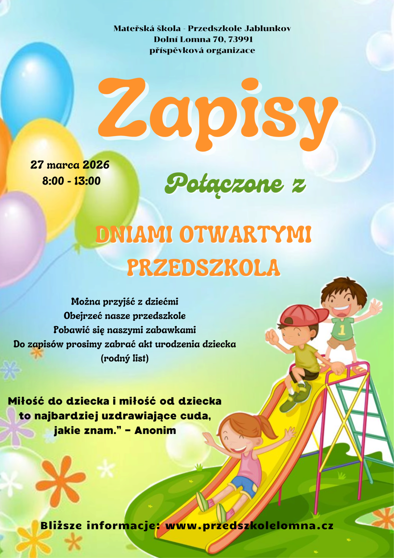 serdecznie zapraszamy wszystkie dzieci do zapisów do naszego przedszkola na rok szkolny 2026/2027.